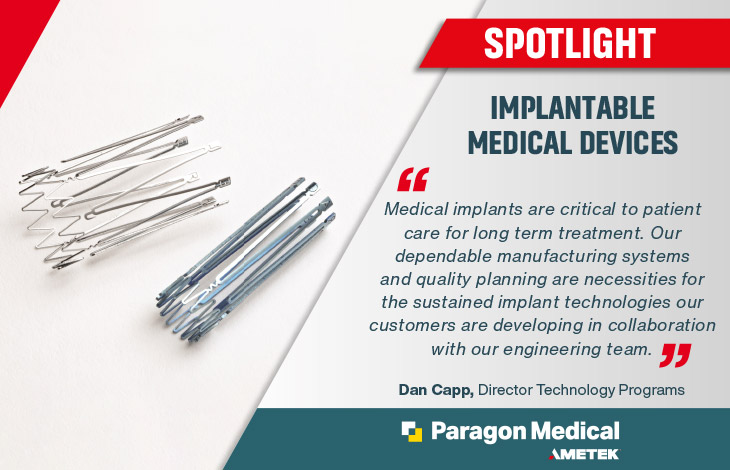 “Implant medical devices are critical to patient care for long term treatment. A dependable manufacturing system and quality planning are necessities for these sustained implant technologies. At Paragon Medical we have built such systems and collaborate with our medical device customer on a project bases to continually improve our manufacturing and quality offerings.”